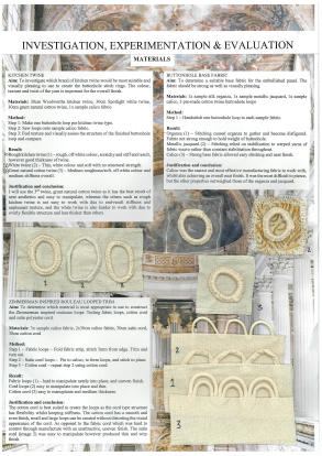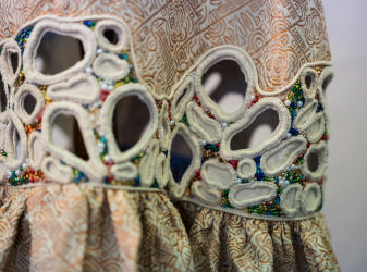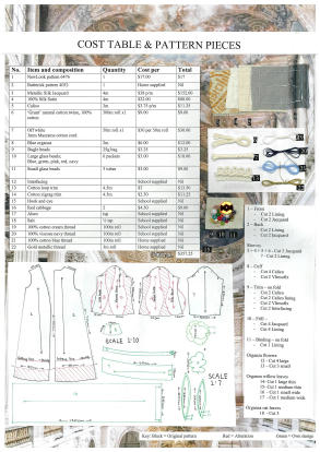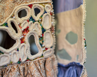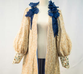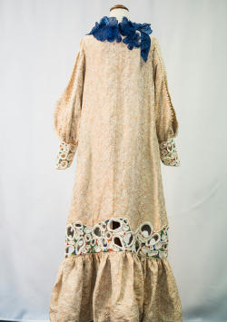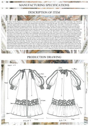 "Garment for Glory is inspired by the majestic apparel imagined to be worn within the heavenly realm. My MTP wearable Textile Art is a full-length robe, constructed from a silk and metallic blend jacquard fabric, lined with a silk satin. The satin was naturally dyed using red cabbage with alum, creating a subtle shade of lilac blue with unique highlights of violet. I aimed to incorporate as many natural materials as possible for an environmentally friendly outcome. The Bishop styled sleeves are divided to provide shape. Their top seams are continuous handmade cotton cord loops. A highly embellished section - placed around the base of the robe and cuffs - consist of hand crocheted buttonhole rings, stitched to a calico base. Colourful beads and sequins are hand stitched between the rings. The centre of selected rings have been cut out to provide contrast. A fine natural cotton trim is used to edge the centre front opening and lower hem. A deep blue organza was used for the free motion embroidered neckline embellishments, for its colour and high lustre. These depicted natural leaf and floral shapes. Many artists and exhibitions contributed to the inspiration for the design and techniques, including Thomas Cooper Gotchs painting The child enthroned, Nick Caves exhibition UNTIL, the 2018 MET Gala theme, beading and contemporary designers; Galia Lavhavs couture evening coat Elenor in person, Zimmermanns spring 2018 Golden time collection and textile artist Jean Draper. I was pleased with the contrasting elements of using everyday items, inspired by Nick Caves work, such as cotton rope, kitchen twine and calico against the luxurious metallic jacquard, silk satin and glass beads. The learning process included trial and error to create features for my garment. Traditional hand techniques were used alongside more innovatively achieved features. I learnt that time management and passion were essential to complete this major textile project to reach its full potential of detail and exacting manufacturing. I enjoyed the freedom to design a garment which is innovative and unique to my personal creative process. Pattern making was one of my greatest challenges; to determine correct dimensions and shape of each pattern piece to give the desired finish. I valued and thoroughly enjoyed every aspect of the major textile project process, from researching and curating the design, and critiquing colour combinations whilst sourcing natural fabrics with appropriate properties and characteristics suited to the garments function and aesthetics. "