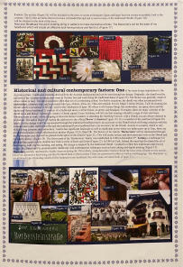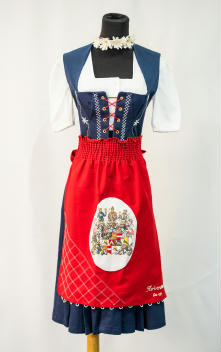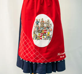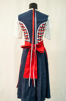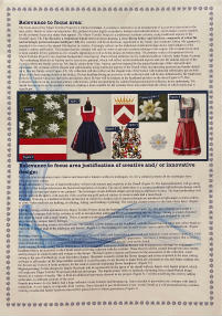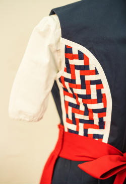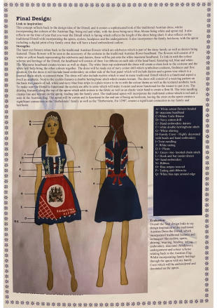 "My project is a costume which expresses my Austrian heritage which I've designed to be a family heirloom. My main source of inspiration was the Dirndl which is the traditional female dress worn in Austria. The costume depicted a series of navy blue, red, white, yellow, gold and green.These colours are highly significant to the heritage of the traditional costume with these colours representing the national flag of Austria as well as the traditional flower edelweiss. Another source of inspiration was my heritage, being of an Austrian background I made the apron featuring my families crest Herberstein, which was digitally printed and embroidered. My collection incorporates many creative and innovative features.The creative techniques consisted of hand embroidery, weaving, tatting, beading, shirring and macrame.The hand embroidery featured on the dress and apron added texture and significance to the costume to inform the wearer about the origin of my family. I created a fabric through weaving red, white and blue bias tapes to add both texture and design to my project. By creating my own tatted lace work on the bottom of the apron adds to the uniqueness of the costume. The shirring on the waistband of the apron added texture and interest. The innovative techniques consists of digital printing and laser cutting.My family Heirloom was represented on the apron with my family crest being digitally printed, making it unique.The flowers were created using the laser cutter and was layered to form texture and volume.The materials used were cotton drill, voile, tulle, polyester, embroidery thread,shirring elastic and satin ribbon. Through this process I learnt how to manage my time efficiently to complete all tasks to the best of my ability. I learnt how to make a macrame headband, tatting, weaving and hand embroidery. The most difficult stage in producing my project was the hand embroidery, as it consisted of fine and accurate pression when embroidering.The tatting and the macrame where also difficult as they both were time consuming as they consisted of several knots and patterns to follow in order to create an aesthetic look.The most enjoyable experience was the fulfilment when I completed a stage of my project, as my costume had several pieces it was rewarding to see the finished product and the development of each piece come together over time."