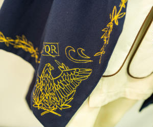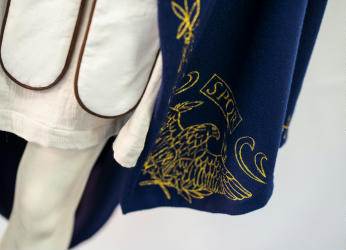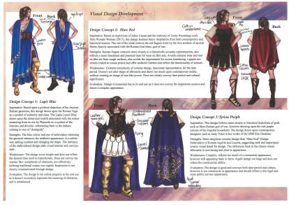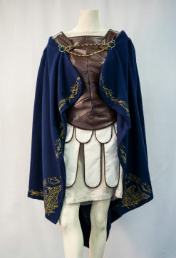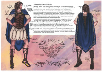 "My design 'Imperial Reign' is created as a four piece costume collection for cinema film. The costume is based on the character description from Rick Riordan's book series 'Heroes of Olympus', Reyna Avila Ramirez Arellano. The collection heavily focuses on Ancient Roman design and it references traditional manufacturing techniques. Inspiration for the costume draws from Lindy Hemming's designs in Wonder Woman (2017), Michael O'Conner's from The Eagle (2011), Janty Yates's work from Gladiator (2000), as well as designs from Assassins Creed Odyssey and the Alta Mode autumn/winter collection 'Valley of the Temples 'by Dolce and Gabbana. Cultural and historical heritage of Sicily, Italy and Greece, as well as mythology such as Pantheon gods, Athena, Concordia, Ares, and Bellona were used as a source of inspiration. The corselet was crafted from lambs' leather, with faux suede lining and piped edges. The under tunic and lappets are made from hand dyed cotton with lappet piping in contrasting faux suede and the metallic gold free machine embroider cloak made from wool/cashmere- the materials chosen aimed to reflects an ancient world. Ingredients for the dye made for the cotton garments were hand collected and brewed to replicate ancient roman clothing. Creative techniques used includes; free hand machine embroidery cloak, natural dyeing, multiple panelled corselet, eyelets for closure treatments and piping. I learnt many new skills over the course of the project, these included natural dyeing, drafting patterns, leather working and making fabric bias and cording. I refined cool skills such as hammering eyelets and free machine embroidery along the cloak edges, piping and facings etc. The free machine embroidery of the Roman Aquila symbol in each corner of the cloak with the letters 'SPQR' (meaning 'Senatus Populusque Romanus') and grape vines was a lot of fun (however time consuming) and was the most creative and rewarding part of the whole costume. The under tunic was easily the most time consuming, taking three modifications to pattern toiles to achieve the right shape and fitting. Overall, I learnt the most about pattern making as each piece is hand drafted with several toiles being made to ensure shape and fit of the garment. There were definitely large challenges, specifically due to the nature of leather being unable to be unpicked and resewn."