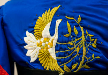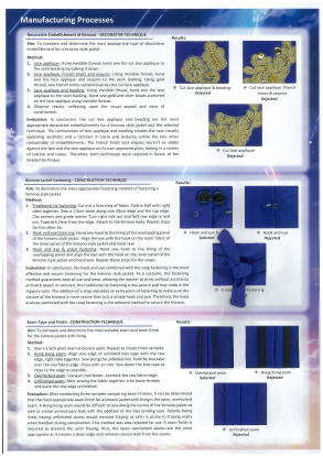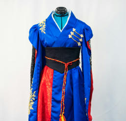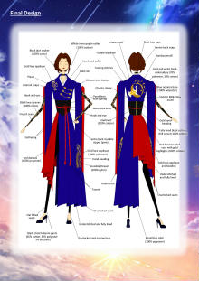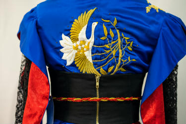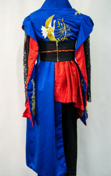 "My major work serves as a costume to be worn at the Japanese Tanabata Festival. Therefore, it draws a lot of inspiration from the story the Tanabata Festival honours, which centres around the Milky Way, and the common motifs of the festival such as bamboo. The centre back of the kimono-style jacket features a hand-embroidered design including a crane motif, bamboo and stylised Milky Way design created using gold embroidery thread on sheer organza. It is needle-turn appliqued to the back and further decorated with hand-beading. The hand-embroidery proved to be the most time-consuming and challenging process of creating my major work due to its size. However, it was enjoyable to gradually work on and once completed, its the aspect Im most proud of. The collar style and hanging sleeves draws from the recognisable design of the traditional Japanese kimono. The jacket features gold cut lace applique and hand-beading, and the black lace sleeves constructed with French seams are worn under hanging satin sleeves. The inclusion of lace and beading takes historical inspiration from Victorian lace and Art Nouveau and adds texture. The hanging sleeves includes an opening from the middle of the sleeve head, creating a new innovative, contemporary design for Japanese kimono sleeves. The waist corset is a modern interpretation of the traditional obi worn with kimonos, allowing for an alternative style that has ease of wear with a zipper in the back, while also taking inspiration from Victorian waist corsets. It is top stitched along both sides of the boning channels. It proved difficult to achieve even stitches, but with enough practice I managed to get to a point where I was satisfied. The cord tie is hand-braided using a series of red and gold cords and decorated with a traditional Japanese knot. Colours like red and gold also hold great significance in Japanese culture. The black fitted jeans include waist darts and flat felled side seams. The combination of different fabric textures and the contemporary style of including pants and an asymmetrical skirt draws inspiration from Japanese singer Shouta Aoi, who is known for his androgynous style and bold outfits, also often inspired by traditional Japanese clothing. This major work gave me the opportunity to learn many new techniques too. I learnt how to make pants and insert boning, and I self-drafted all my own patterns for the kimono-style jacket which I am extremely proud of."