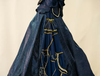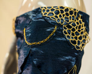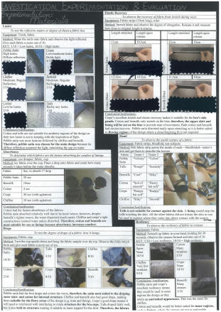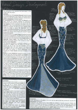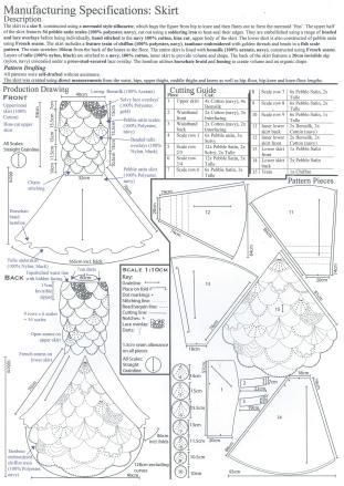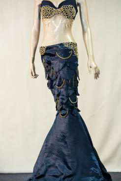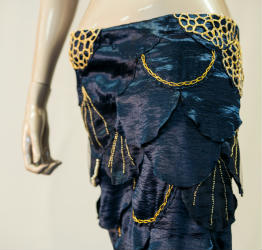 "My Major Textiles Project is constructed as separates: a mermaid style skirt and bra. This striking silhouette conveys my inspiration as the dramatic flare of the skirt contrasts the slim bodice to emphasise the shape of a mermaid tail. The bra is designed as a cross between a full figure and t-shirt style for comfort, promoted silhouette and additional modesty coverage. The costume includes functional aspects such a zipper, darts, back bra closure, adjustable straps, underwire and a boned hemline. All patterns were self-drafted without assistance. The bra was drafted through direct measurements and templating and the skirt through direct measurements. I was inspired by cultural aspects of mermaid lore from many nations. I utilised legends of sinister natures to inspire my choice of dark colours. The gold embellishments were chosen to reflect the sun on the water at dusk. The interplay of yellow and blue was also inspired by the captivating use of these complementary colours in Vincent van Goghs historic paintings Starry, Starry Night and Café Terrace on the Place du Forum. Historically, mermaids have appeared in many other artworks, represented in artworks by John William Waterhouse and Ferdinand Leeke. I combined the elements of these traditional representations with contemporary adaptations such as Disneys Little Mermaid. Contemporary designers including Alexander McQueen, Jean Paul Gaultier and Romance was Born inspired the silhouette of the design as well as a range of the techniques employed for an aesthetic garment. The upper half of the skirt features 54 pebble satin scales which are embellished using a range of beaded and lace overlays. The skirt has tulle support and a boned hemline to promote silhouette. The horsehair braid hemline was chosen to provide an organic shape to the skirt. The skirt also features a chiffon train, tambour embroidered with golden threads and beads. This fish scale pattern is mirrored in the drop beading feature of the bra to reflect the inspiration of nature. I incorporated innovative techniques of using a soldering iron to cut out the individual scales in order to heat seal the edges. I also constructed a gold lace by couching yarns onto solvy film to generate an innovative and customisable lace design to reflect the inspiration of bubble rings. Furthermore, the use of natural cabbage dying for the lining of the bra cups is an innovative and sustainable alternative to synthetic dyes as it reduces pollution to waterways."
