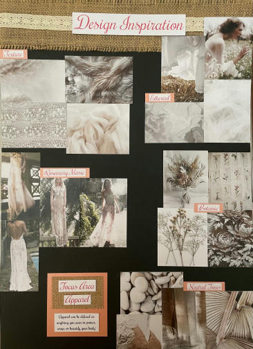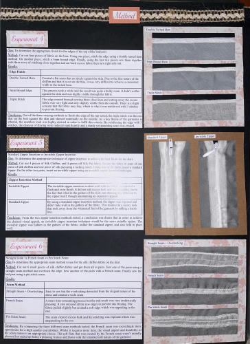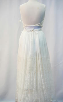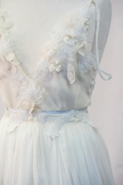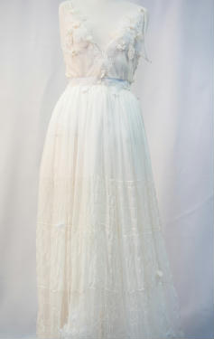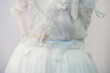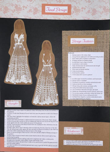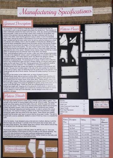 "The ensemble is a fine balance of delecate fabrics and embelishments that are constructed to beautify and protect the female form. The inclusion of cotton underwear protects the lower half of the torso, while also allowing breathability and functionality. Cotton lycra provides stretch which enables comfort and accessability of the garment. This fabric combined with the use of snaps in the crotch ensures the garment is easy to dress and functional during wear. Having the bodysuit bodice cut on the bias ensures comfort during wear, complementing the lower cotton lycra. As well as using the bodysuit as a layer of protection and modesty, the additional textued lace detail of botanical theme strategically placed across the bodice section ensures modesty. Darts above the bust ensure the details of the front panels fit the female form and highlight the curves and bustline. The use of side french seams, and a fully lined bodice ensures the delicate fabric does not fray or have harsh edges that agrivate the skin of the wearer. Delicate narrow rouleau straps hold the top in place whilst not detracting from the ethereal nature of the fabric and design. Sheer, semi-transparent fabrics such as lace, chiffon and voiles became fashionable in Europe in the eighteenth century, used in undergarments or overskirts to provide modesty. This inspired the all over sheer fabric that makes up the outer layer of the skirt, flowing generously from a gathered waistline attatched to a waistband concealed by lace and embelishments. The use of side invisible zipper on the skirt enables the wearer to put on the skirt easily, which, combined with the use of french seams, continues the quality exuding in all areas of the outfit. Beginning at the bottom of the full length chiffon skirt, an array of botanic inspired elements slowly fade up giving an ombre effect. Textured lace detailing and delicate embelishments accentutate the elegance of the garment whilst not detracting from the sheer nature of the garment. Gentle lining is used in the skirt to aid with modesty, whilst also highlighting the etheral nature of the outer layer. The most enjoyable experince that came from the creation of my garment was the opportunity to work with an array of new fabrics and experiment with a variety of techniques. Whilst this was challenging, it was also very rewarding to see all the hard work come together into my final beautiful product."
