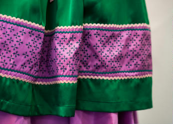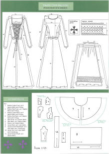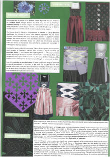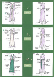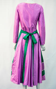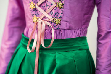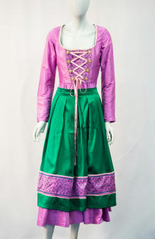 "This design is a two piece costume for Rapunzel. The garment is intended to be used in theatrical performances and then displayed in an exhibition. I have used 100% silk fabrics as they are rich in quality and have many properties that are suitable for costume. The German dirndl is one of my central inspirations for this design as this was the form of clothing in the period and setting that Rapunzel was written in the Brothers Grimm collection of fairy tales in 1812. The colour scheme for my garment is split complementary with amethyst purple and deep emerald green symbolising the plant in which Rapunzel was named after. The main dress is purple, composed of silk dupion. An innovative pattern has been block printed in an emerald green colour onto the main fabric and used for the centre front bodice panels. At completion of my project, I have learnt much about printing. The biggest challenge was to learn about new technology, specifically computers and the laser cutter. This challenge however, proved to be the biggest learning development for me and it allowed me to construct a costume that is irreplaceable. Gold dirndl eyelets have been stitched down the front bodice seams and a pink ribbon is laced through the eyelets across the bodice. The apron is composed of 100% silk satin and features a fitted waistband with a bow tied on the right hip. The apron is deep emerald green. This colour was my initial source of inspiration and an element that I definitely wanted to include in my design. The garment bodice is fully lined for a professional finish. I thoroughly enjoyed the creative processes of my Major Textiles project. My MTP was a labour of love and I very much enjoyed creating something from scratch and manipulating patterns to create something that is truly unique and something that I am proud of."