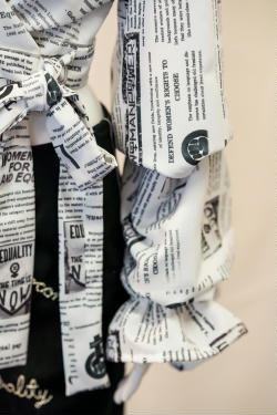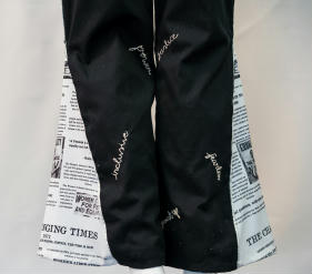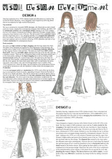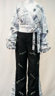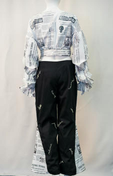 "My work is historically inspired by 1970s Womans Rights Movements and the resulting silhouettes and fashion trends that defined the 1970s as an era of radical female empowerment. I have created a two-piece garment consisting of high-waisted flared pants accompanied by a wrap, tie top with long, tiered, billowed sleeves. Contemporarily inspired by designer John Galliano and his use of newspaper print in his collections, a print containing 1970s feminist news articles, quotes and posters from Womans Rights rallies has been innovatively sublimation printed onto the white polyester fabric used in the top as well as the godet insert in the outer side seams of the black cotton drill pants. I innovatively modified the commercial pants pattern by creating my own godet from the same fabric and print used in the top to create the flare by inserting the godet in the lower, outer side seam of the pants. I have utilised silver motifs through my work not only to contrast the monochromatic colour palette, but because silver is seen as a symbol of femininity and illumination, therefore symbolising the female liberation sought for and subsequently gained throughout the 1970s. Silver piping has been creatively inserted in the outer side seams of the pants as well as the upper edge of the waistband of the top. Silver lustrous calligraphy embroidery of key words and phrases found in the newspaper print cascade down the pant legs, some of which are embellished with clear beads, vine stitched or back stitched. Overall, I thoroughly enjoyed creating my Major Work, time restraints were definitely a challenge, but the project fuelled my love for fashion and design immensely. Seeing my newspaper print being brought to fruition as I sublimation printed my fabric was so rewarding and my most favourite part of the project. Not only did I learn the importance of time management in textiles production but also the integral role experimentation and modification plays in allowing your work to look and perform to the best of its ability."