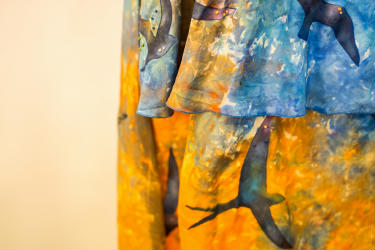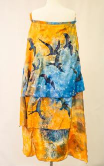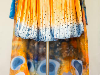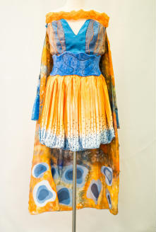 "A manufacturing technique that contributes to the success of my project is the use of hand dyeing which can be found on the ice-dyed cloak, ombre skirt and lining. I chose to dye most of my fabrics to achieve the unique, variant and vibrant colours of sky blue and burnt orange. This contributed to the aesthetic design of my project as it drew practically from Wolseley’s design process and allowed the art piece to embody unique colouring as if it had been painted."