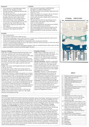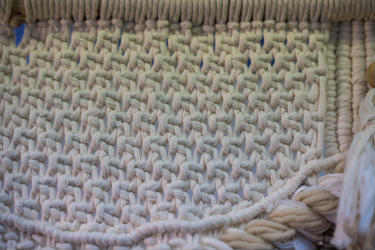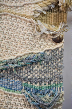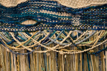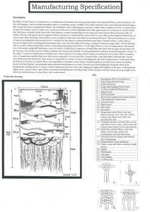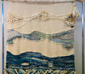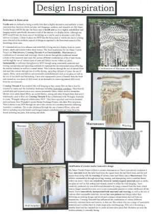 "My Major Textile Project was inspired by Macraweave, Crossing Threads ® and Sustainability. Macraweave (a combination of macramé and weaving), which is shown through the traditional natural colours of the macramé rope used, the various different combinations of the 4 basic knots, and through the use of various types of yarn and fabrics woven within my piece. Sustainability is reflected throughout my MTP through using sustainable materials and reusing, repurposing and upcycling materials to represent the environmental issues affecting the textiles industry as well as a coastal theme. This is shown through the use of natural blues and sand like colours through use of coffee dyeing, upcycling old pairs of jeans, the use of organic fibres, yarns and fabrics and sustainable embellishments such as sea glass as well as the use of sea shells and fish netting. I have also repurposed a piece of branch from the bush and created my own piece of drift wood, as an alternative to removing natural drift wood from the environment. Crossing Threads ® has inspired my wall hanging as they create fibre art that is heavily inspired by nature and the Australian landscape including Australian coastlines. Their heavily embellished and textured pieces use various sustainable fibres, which involve Australian Merino wool, plant-based fibres, up-cycled fabrics, roping and other foraged items that arent traditionally used in fibre art. I have creatively produced my own driftwood alternative by using a branch from the bush, which was no longer attached to a tree, as it is not a sustainable practise to collect driftwood off the beach and I have innovatively incorporated both macramé and weaving, as well as the use of various other sustainable materials, devised my own pattern and design rather than following an existing design, and developed a unique interpretation derived from my inspirations. During the process of making my MTP I learnt various unique, creative and innovative techniques to incorporate throughout my work and to be able to utilise basic macrame and weaving techniques in various different ways and combinations. The most enjoyable and valuable aspect of my MTP was using my hands to knot and weave all elements in my wall hanging and during the process being able to escape from other stresses. The most challenging aspects of the process of my MTP was the size and dimensions of the wall hanging and also completing it during lockdown at home."