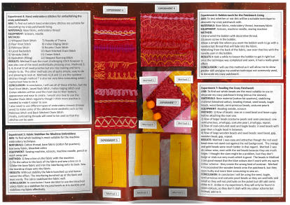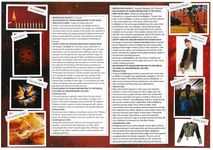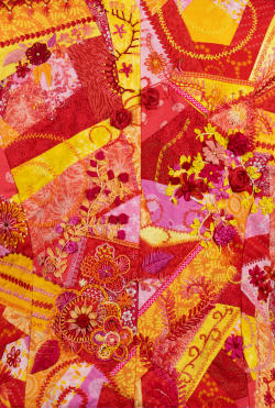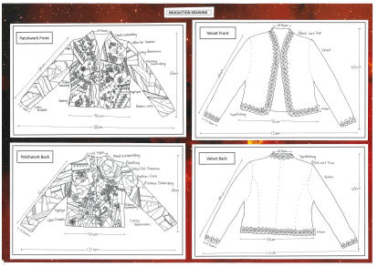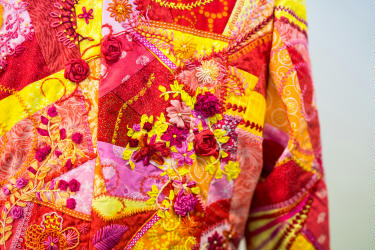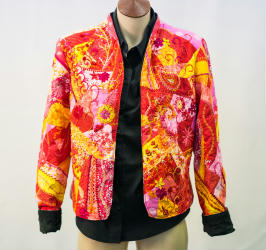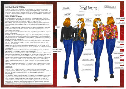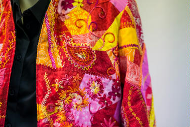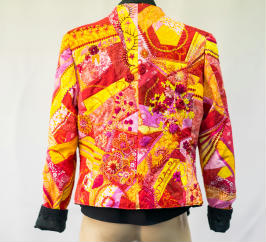 "My wearable textile art project is a reversible bolero jacket that has plain, black velvet on one side and colourful patchwork on the other. It was inspired by bolero and matador jackets, crazy patchwork and the emotion of passion. I used the bolero style to create the shape of my jacket (long sleeves, short length) and the matador style to decorate it by incorporating black lace trim around the edges of the velvet side of the jacket. Crazy patchwork enabled me to experiment with a variety of techniques and create something that was visually interesting. Passion gave me the colour scheme for the patchwork since warm colours (particularly red) are usually associated with this emotion. I used a premium black velvet material on one side of the jacket and a variety of cotton fat quarters on the other to create the crazy patchwork. I have used silk ribbons, cotton embroidery threads and assorted beads to decorate the colourful patchwork lining with a number of creative techniques including hand embroidery, ribbon embroidery, beading and machine embroidery. My most frequently used hand stitches include lazy daisies, French knots, stem stitch, and chain stitch. I learned how to accomplish many of the skills and techniques mentioned above including silk embroidery and crazy patchwork. I also learned a great deal about time management which is an area I found particularly challenging especially after self-isolation earlier this year. As much as I enjoyed embroidering the jacket and watching as it came together before my eyes, the most rewarding experience was doing the last step in the process (the topstitching around the edges) because I could finally see what it looked like as a whole and the relief of finishing the project was very exhilarating. It was also a relief knowing that my wonderful teacher could finally take a break from anxiously asking me when I was going to finish embroidering the project! My greatest challenge was time management and knowing when to stop. My teacher (as mentioned before) was very worried I would keep embroidering until I had run out of time to sew the jacket together so learning to use more time efficient techniques and larger decorative patterns was a big learning curve and an interesting challenge for me. My greatest sewing challenge was embroidering with the ribbon, which would not always look how I wanted it to."