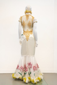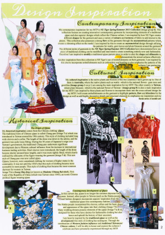 "I combined existing patterns to create my unique garment. I used the bodice section of a Qipao dress and the skirt of a mermaid wedding dress, adjusting the patterns at the waistline to ensure a perfect fit. These modifications allowed me to represent both my Taiwanese and Australian cultural heritage. "