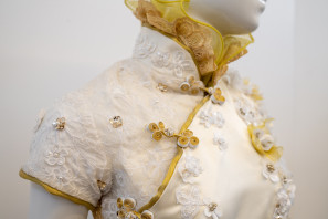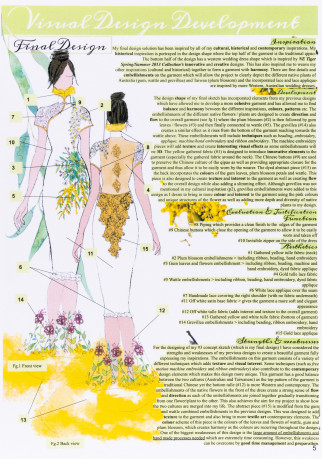 "Free-motion machine embroidery techniques allowed me to create my own lace which is a feature of the right shoulder embellishment on my dress. I designed my own pattern and thus created a unique and original lace. This technique was also used to create the three-dimensional gum leaves featured on the waistline."
