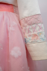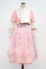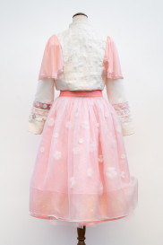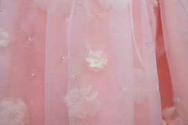 "The laser-cut organza flowers are heat sculpted into their three-dimensional shape through the Somebana technique, then layered and held together with pearl/crystal beads to emulate flower buds. They contribute to the intricacy and sophistication of the design and create a visual element that attracts people to admire the garment up close."