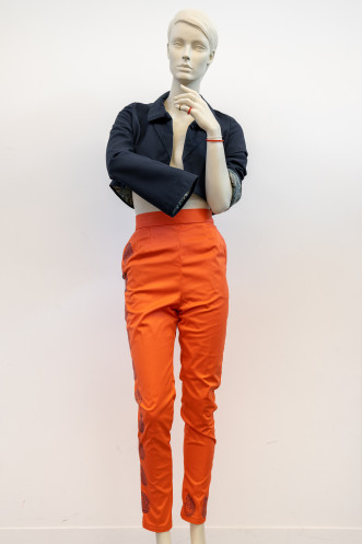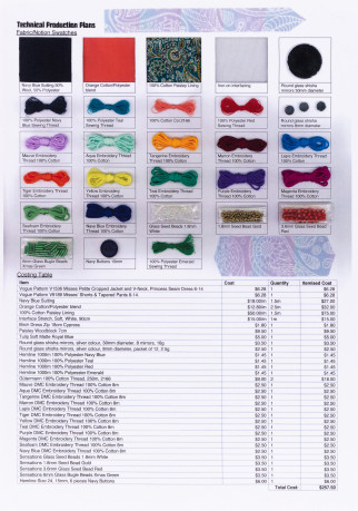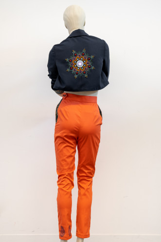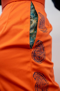 "Block printing of the paisley design as a ‘trail’ up the side of the pants was to mimic the design of the lining fabric utilised for both the jacket and the inner pockets. It also served as a visual colour link between the jacket, pant and lining fabrics."