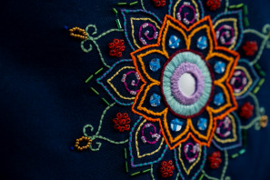"Hand embroidery was used to create a large mandala design on the back of the jacket, which is the centrepiece of the project. It complements the inspiration, particularly Persian art, through the application of a variety of stitches and colours."
