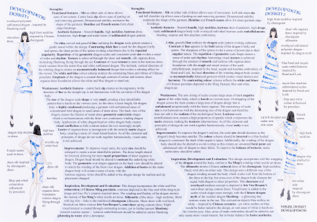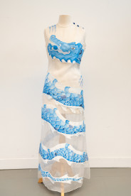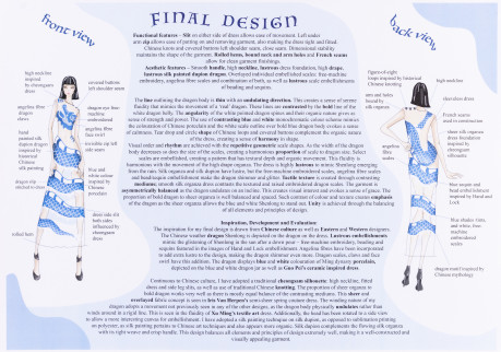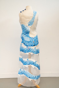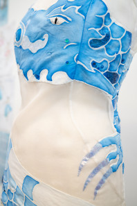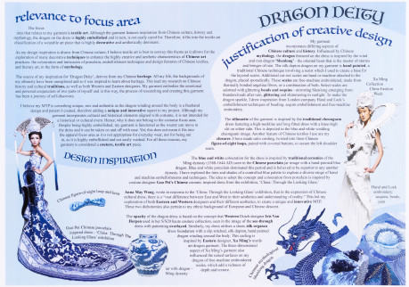 "Invisibly slip stitching the silk-painted dragon image onto the silk organza backing fabric creates an illusion of the blue dragon flying through the translucent atmosphere. Wrapping this image around the body of the dress helps to capture the myth of the Chinese dragon; winding through the air, orchestrating the weather."