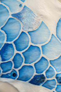 "Hand stitching lustrous sequins and beads to the dress creates the effect of raindrops glistening in the sunlight, and links directly to the blue silk-painted dragon and the blue of water and of the sky. This links to my inspiration of the Shenlong dragon emerging from a thunderstorm, shimmering in the sun."