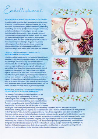 "A surface decoration technique that I utilised in my project was embroidery. I created a floral pattern that I hand embroidered onto the décolletage of my bodice. This created an aesthetic component for my Major Textiles Project which enhanced its overall look."