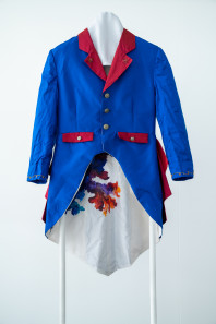 "In order to create a feature of the contrasting two tone silk taffeta flounces that adorn the back of the tuxedo jacket, they were cut in a waterfall style shape and stitched into the side and side-back seams of the lower jacket."