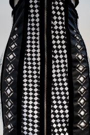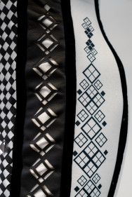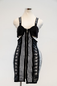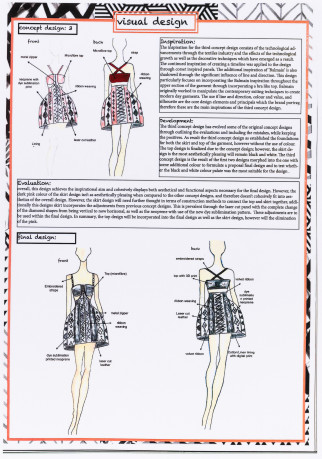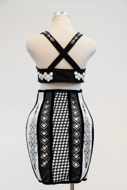 "The manufacturing technique of ribbon weaving to create a fabric used contrasting black and white ribbon to produce an aesthetically pleasing pattern which supported the black and white colour scheme of the dress. The created fabric was placed diagonally on the dress which further emphasized the diamond design motif. The weaving added a visual textural feature highlighted by the lustre of the fabric in it's curved surfaces."