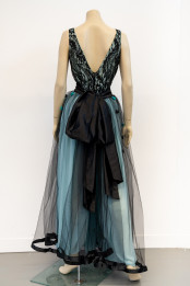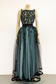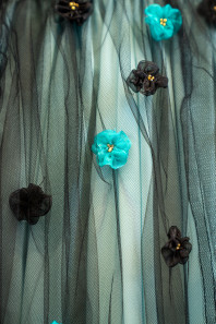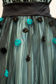 "Hand embroidery is used to attach the ribbon flowers with gold bead centres to the outer tulle skirt. They are in blue and black to match the colours of the dress and cascade from the waist down."