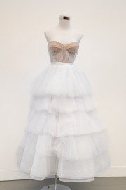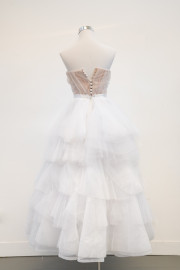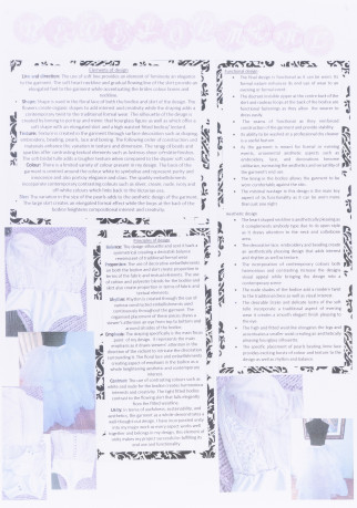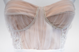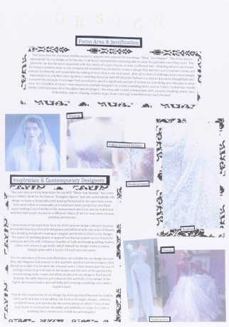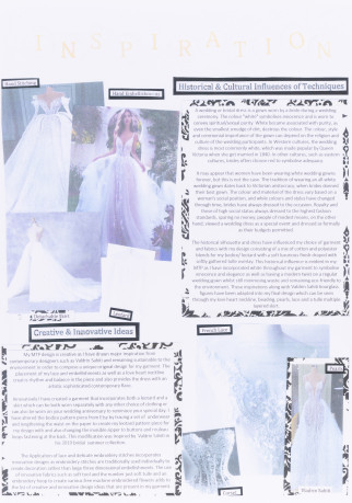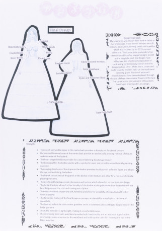 "The main manufacturing technique that stands out in my design is the draped pleating of tulle on the bodice. The pleating was hand-draped and stitched onto each panel. Seam lines were then highlighted using beading to add structural support to the bodice and a decorative element."