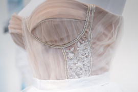 "The hand stitched lace appliqué on the side panels of the bodice adds fine detail and softens the look, giving it a luxurious appearance. "