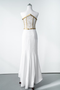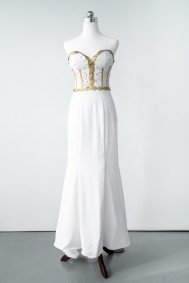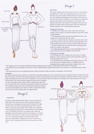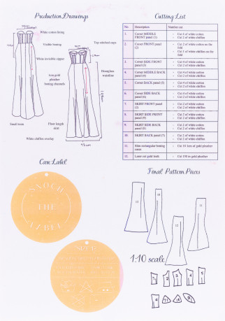 "The structural integrity of the bodice is due to the accurate placement of boning channels and boning. These channels are aesthetically enhanced by use of the contrast gold colour."