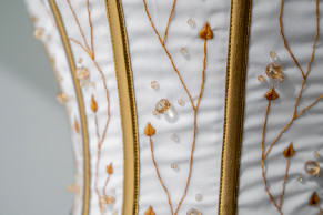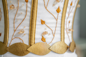 "Fine and delicate hand embroidery of olive leaves and gold beading is shown on the bodice panels between the boning channels."