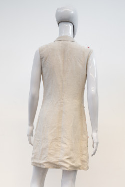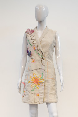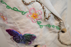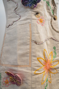 "The embellishments on my dress include free-hand machine embroidered flowers, and beading amongst the flowers to add a life-like quality. Cords to represent the vines were hand-made and were then attached using couching techniques. The butterflies can be removed when the dress is being laundered."
