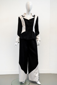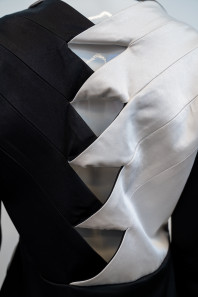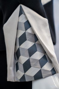 "The triaxial hand weaving made from satin bias binding was placed inside the godets to create a three-dimensional illusion in contrast to the simplicity of the plain black and white suiting. This design was inspired by the geometric patterns which can often be found on suit ties."