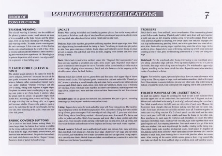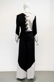 "The folded manipulation on the jacket back is from a self-drafted pattern and constructed with sateen suiting, a strong fibre blend able to support the structured shape. The diagonal direction created from the panels and triangular cutouts mirrors the angular shape of the pant and sleeve godets, increasing the work's cohesiveness."