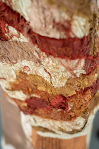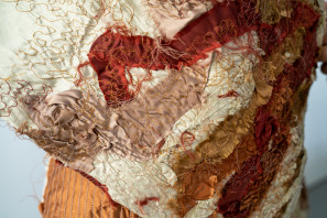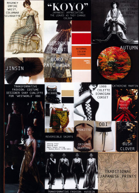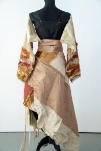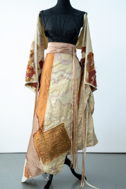 "Textured boro patchwork is found on the detatchable kimono sleeves adding sensory variety to the garment's handle as well as introducing a range of accent hues such as burnt caramel and ash browns which complement the autumn colour scheme. "