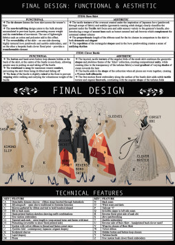 "The cream-coloured mesh, origami-folded bustle skirt is decorated with black free-motion machine stitched floral embroidery which is focused on the hem, then reaching up and following the folds of the garment in elegant tendrils."