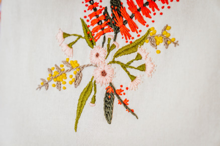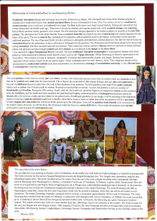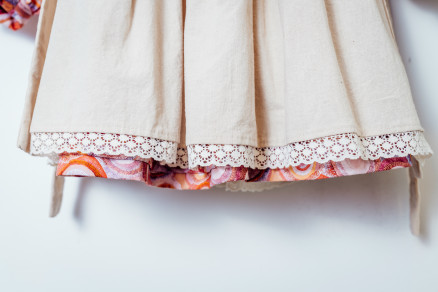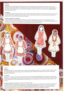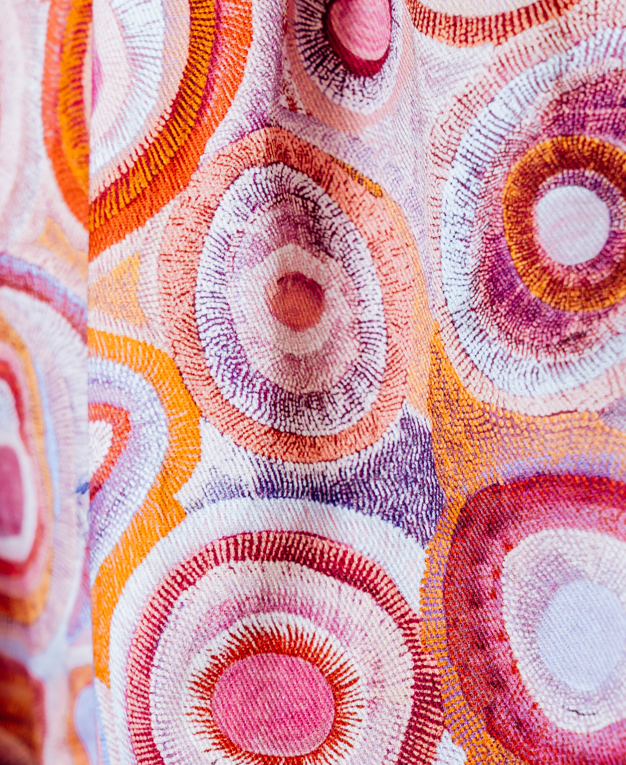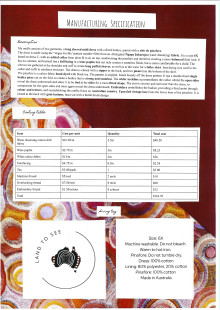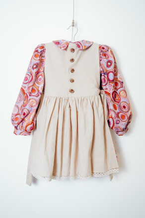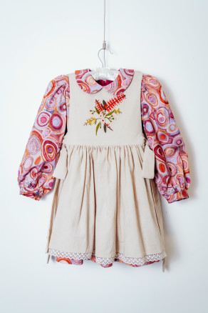 The design reflects the traditional customs of pinafores, being simple and easily cleaned. The upcycled vintage lace hemming, providing a subtle reference to its inspirational roots, that of colonial designs. The indigenous fabric on the dress, and its use of traditional iconography links to the historical textile practices of Indigenous Australians for generations. The outfit consists of two garments, a long-sleeved midi dress with a fitted bodice, paired with a side tie pinafore. The dress is made from an Aboriginal Ngapa Jukurrpa (water dreaming) fabric is fully lined in a wine poplin that not only creates a seamless finish but is more comfortable for a child. The sleeves are gathered at the shoulder and cuff to create long puffed sleeves, as well as at the waist for a fuller skirt. Interfacing was used in the collar and cuffs to reinforce structure. The dress is closed with a zipper at the back, and two pleats line the bottom of the skirt. The pinafore is a calico fabric hand dyed with black tea. It has a double lined single bodice piece cut on the fold, to create a bodice that is strong and seamless. The wider neckline accommodates the collar, whilst the open sides reveal the dress underneath and allow it to be tied at the sides for a more fitted shape. The skirt is shorter and narrower than the dress, to compensate for the open sides and once again reveal the dress underneath. Embroidery embellishes the bodice, providing a focal point through colour and texture, and reestablishing the outfits focus on Australian country. Upcycled vintage lace lines the lower hem of the pinafore. Tt is closed at the back with gum buttons; laser cut with a bottle brush design.