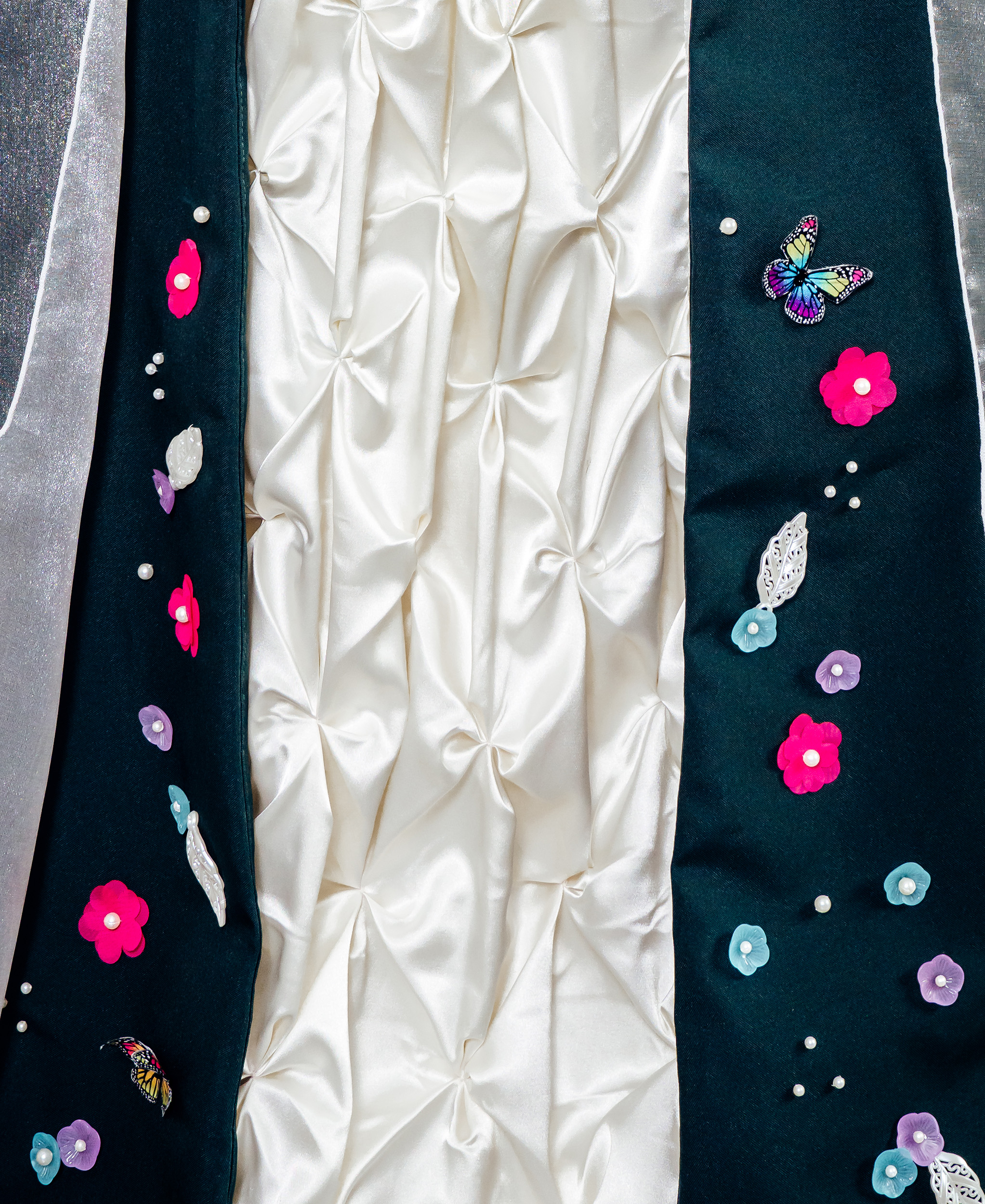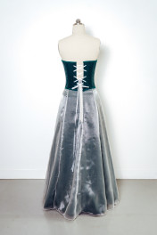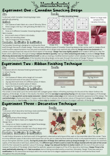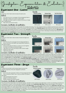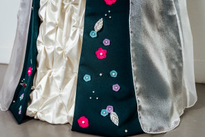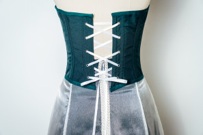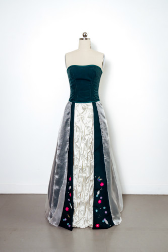 The textile item, Enchanting Floral Costume Design, consists of three parts: a reversible corset, an A-line skirt and an overlay skirt. The reversible corset has a polyester suit fabric exterior and a satin lining fabric that features an embroidered floral design on the back side panels of the satin side of the corset. The corset is boned internally with top stitching along the bone channels. Top stitched bias binding is also used to encase the raw top and bottom edges of the corset. The corset utilises a sweetheart neckline, eyelets at the centre back and ribbon to lace up the corset. The six panel A-line skirt features floral Canadian Smocking at the centre front with a satin fabric. The pattern has been altered to overlay the side front panels using the contrasting suit fabric, these side panels also feature floral embroidery, hand beading and digitised laser cut flowers. Finally, the A-line skirt overlay utilises French seams to enclose the raw organza fabric and a rolled-overlocked hem for the base. The pattern has been modified to be open at the front with a rolled-overlocked vertical edging seam to create closure which allows the Canadian smocking and embroidery to be highlighted. The overlay uses an opaque fabric waistband and an invisible zipper at the centre back which is hidden through the hand application of a pearl trim.