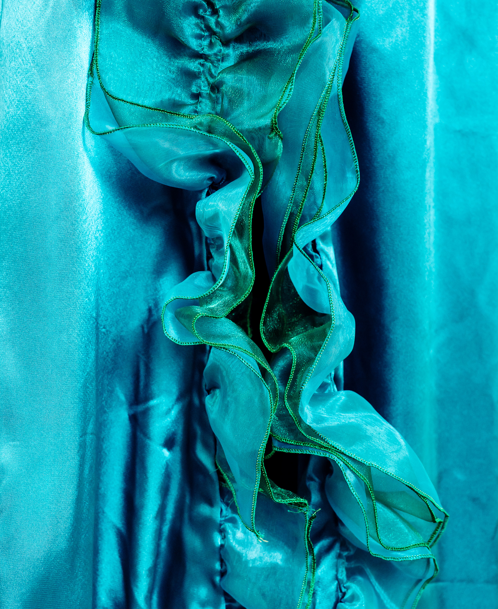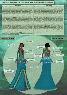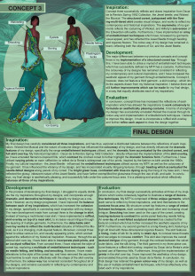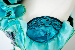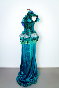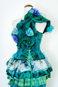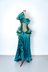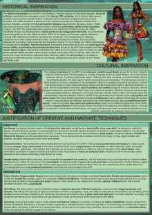 The textile item, Jewelled, consisting of a structured corset, and a long, flowing skirt, juxtaposed with an overlay of extravagant flamenco ruffles. The costume has carefully drawn inspiration from the work of fashion designer Oscar de la Renta, Wicked’ the Musical, and the Jewel Beetle. The historical inspiration of Oscar de La Renta’s ‘Spring 1992’ collection, celebrating the dramatic feminine form through voluminous flamenco ruffles with a cinched waist, has inspired the full skirt overlay contrasted with a structured corset. Contemporarily, the design emulated the costumes of ‘Wicked the Musical’, drawing inspiration from the sculptural embellishments, whereby the student implemented a wet-felted sculptural element to further dramatize the costume. Finally, the Jewel Beetle has heavily influenced the colour palette, specifically the glossy iridescence of the beetle and its varying green hues, which has been reflected through the textures and embellishments of the costume.