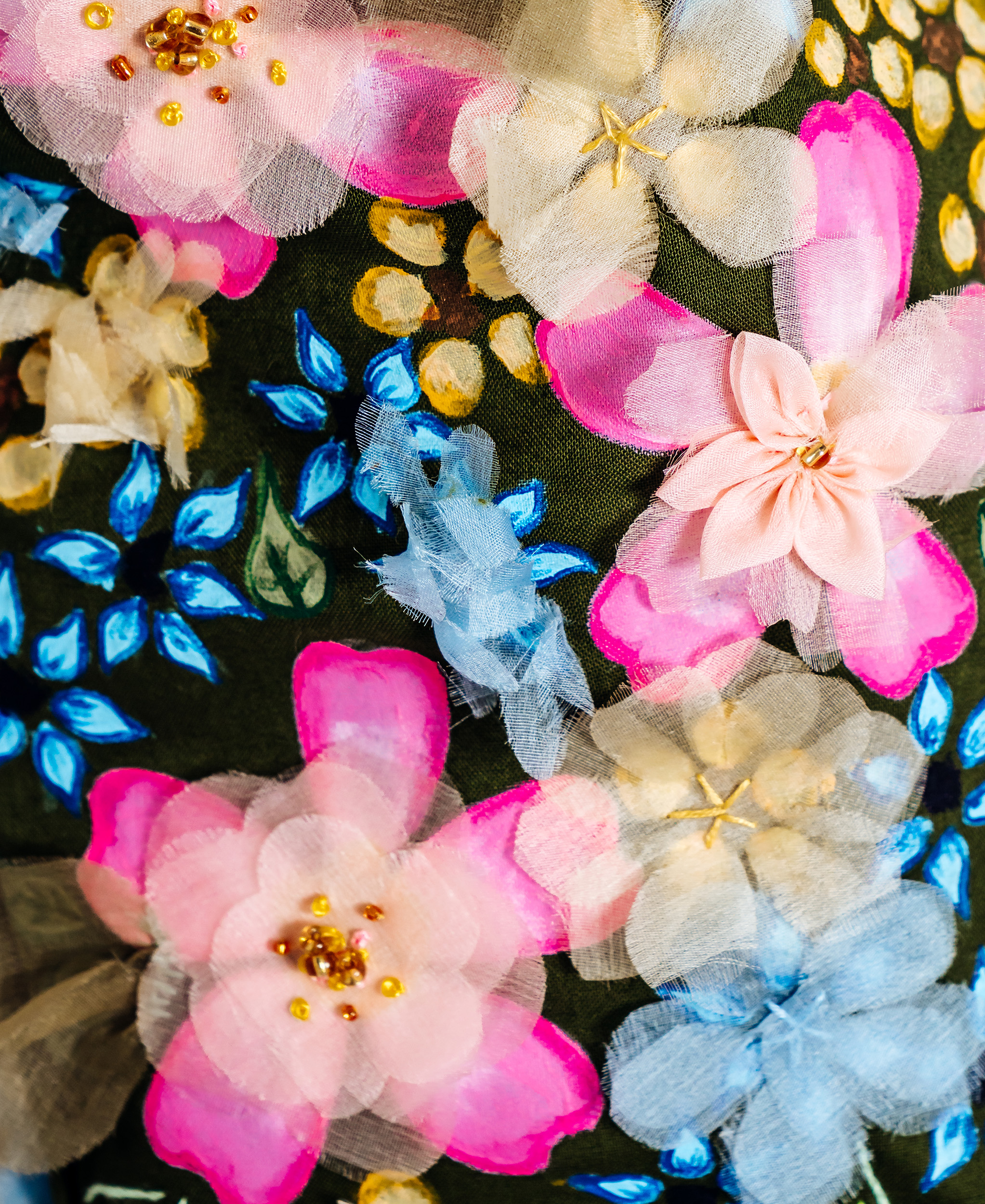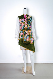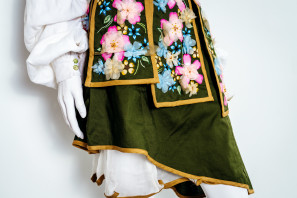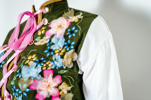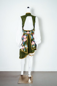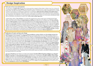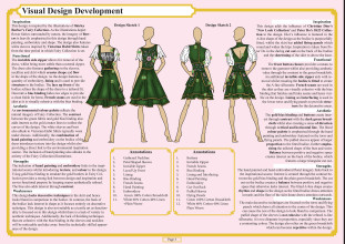 The textile item is a wearable textile art in the form of a blouse and skirt set inspired by Shirley Barber’s children’s book Fairy Collection. It is designed for the end use of being exhibited at the Quentin Blake Centre for Illustration for the 1st anniversary commemoration of Shirley Barber’s death. Alongside Shirley Barber’s Fairy Collections, the design takes inspiration from a range of artistic sources including historical design shapes, contemporary runway fashion and floral arrangements. The shape of the design conveys the influence of a combination of different historical and cultural designs including the Bishop and Peasant style sleeves from the early to mid-20th century, the A-line skirt shape inspired by 1950s Spring Dior and the bodice and panelled skirt style of the modern Vietnamese Áo dài. A more contemporary influence has also been introduced through the cut out back inspired by the daring cuts of Peter Do’s designs. Fairy Collections predominantly influences the colour palette of the design, leaning heavily into green with touches of pastel pink, blue and yellow. Additionally, the gold borders of the illustrations inspired the use of aesthetic gold bias binding in the design. The floral imagery of Fairy Collections is creatively brought to life by the influence of contemporary runway fashion of Kimberly Gordon and Elie Saab. Kimberly Gordon’s designs inspired the ribbon lace up front and pattern-like floral hand painting. Similarly, Elie Saab’s influence is conveyed using sheer fabrics such as chiffon and organza, as well as the inclusion of delicate embroidery and beading.