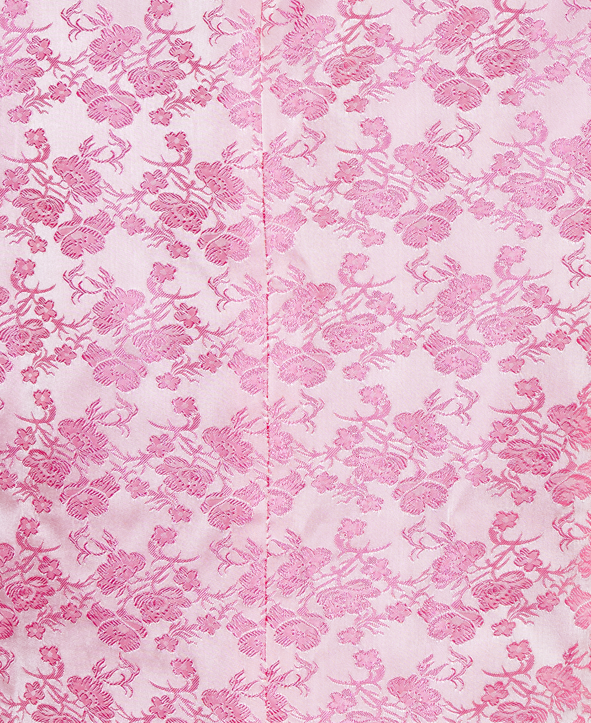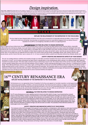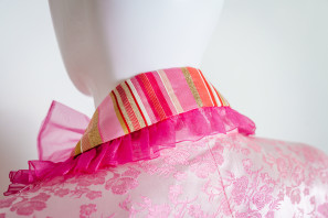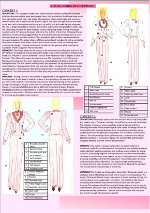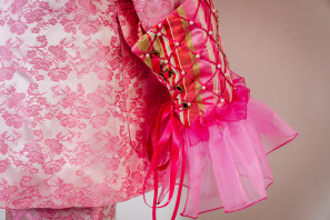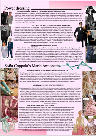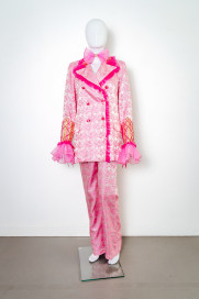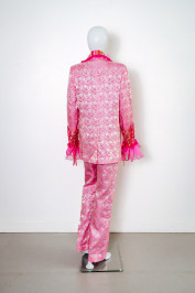 The textile item includes three garments, a double-breasted suit jacket, suit pants and a bow tie. Sources of inspiration stem from Gucci, a 16th-century Renaissance era, power dressing, and Sofia Coppola Marie. The suit jacket and pants work to reflect elements of the 16th century and Sofia Coppola Marie Antionette by using luxurious pink brocade fabric with contrasting details from beading to embroidery, these design elements complement the inspiration of power dressing and Gucci specifically the structured lapel and shoulder pads. The jacket is made from a 100% polyester blend with polyester satin used for the lining. The jacket will also have a contrasting pinstripe brocade fabric on the cuff and a nylon crystal organza blend frill attached to the cuff. The pants are made from a pink polyester brocade blend and lined with Bemsilk. The bowtie is made from two layers of pink organza fabric. A striped brocade band. wraps around the centre of the bowtie where it is hand gathered and held in placed. A collar band connects to the bowtie and is secured by a skirt hook and eye clasp, ensuring ease of wear. The double-breasted jacket adds both weather protection and a refined touch, suitable for formal occasions, embodying elegance and sophistication. Keeping the pale pink rich with floral motifs brocade fabric keeps the idea of femininity yet keeps the inspiration of power dressing through the stricture of the jacket. The pink of the suit transforms the suit from a traditional to a feminine style while still having a powerful structure. This reflects the power dressing structure of Marie Antoinette. The decorative/innovative features of beads, embroidery and frill on the cuff represent the decorative sleeves worn in the 16th century. The proportion of the jacket and pants flatter the figure along with the fitted waist of the jacket and boot pants.