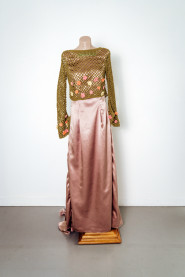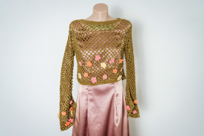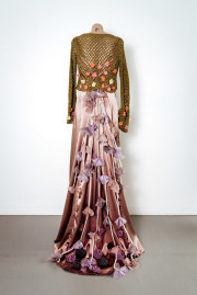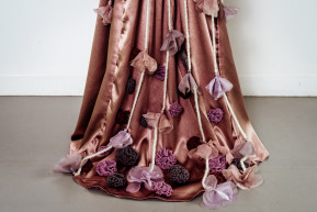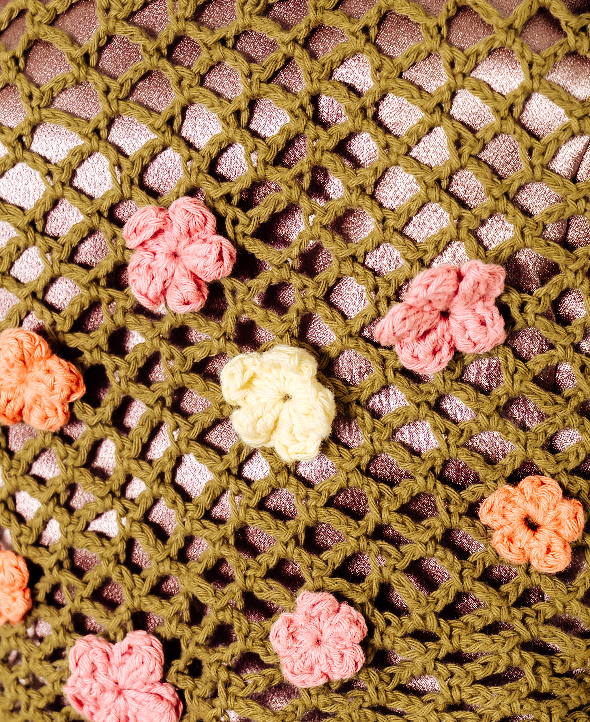"Trail of handmade flowers attached to self made twin. The trail falls over the main fabric of the skirt."