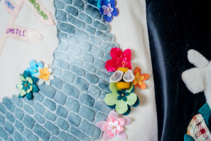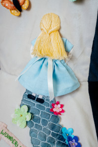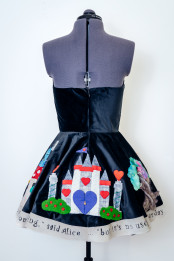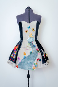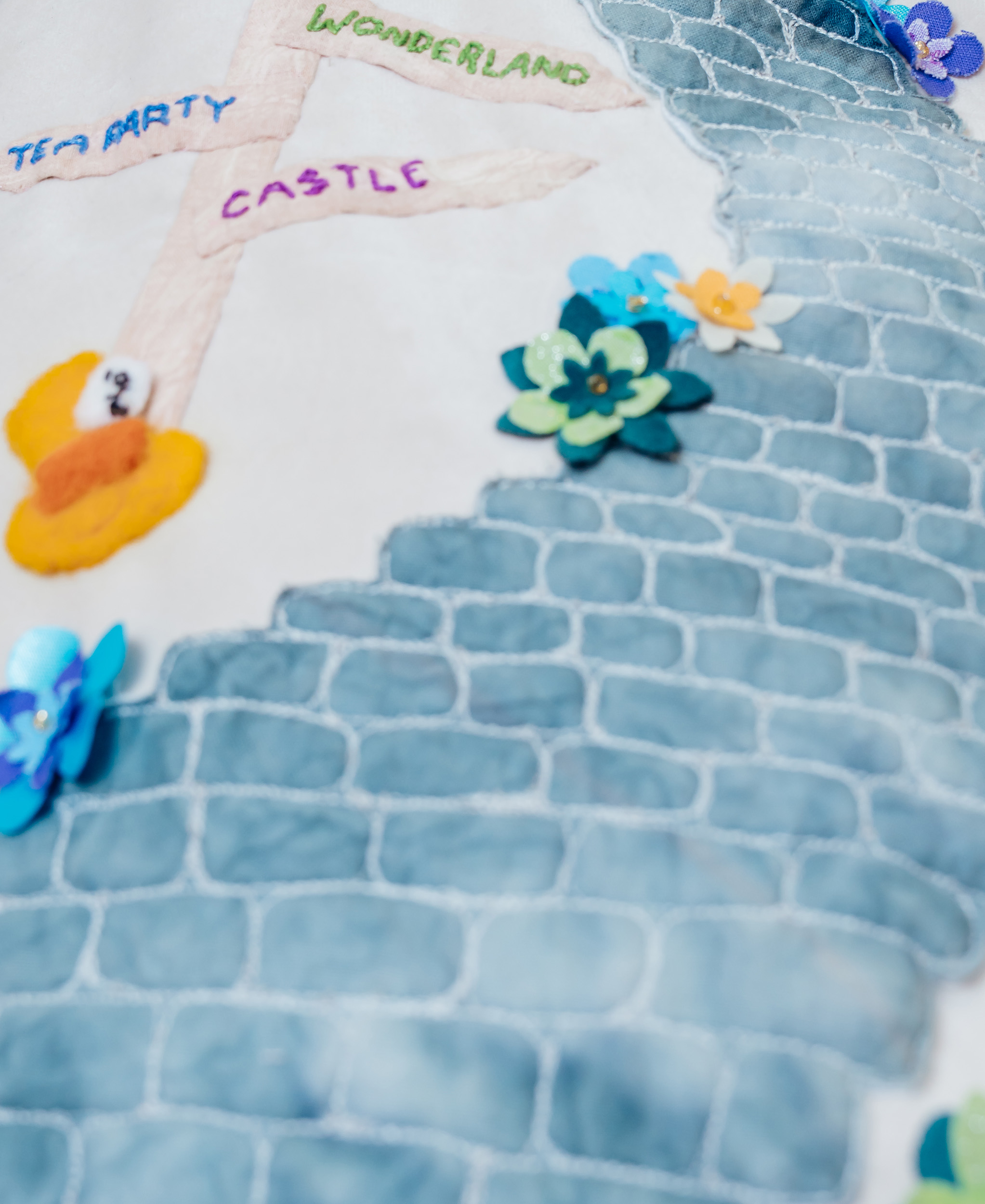 The textile item, wearable art uses a range of fabrics, significantly velvet, cotton, corduroy, chiffon, and silk to create textural contrast and visual interest to draw the eye around the garment. Within the cream-coloured centre is a quote of significance of the design. To create texture, movement and dimension, the laser-cut flowers are arranged tastefully around the path on the front panel as well as the butterflies that fly above Alice. The machine embroidered path creates line and perspective to focus Alice as the centre of the piece. The black velvet provides a rich value to the piece to accentuate the bright colours of the applique. Alice in Wonderland utilises the colours true to Carroll's interpretation of her in the blue dress that includes texture and movement in her gathered skirt. The White Rabbit includes fleecy fabric to mimic rabbit fur, as well as a textured suit jacket to reflect his dignified nature and significantly starts Alice's journey. The felt rabbit watch is significant in emphasising the ticking anxiety of the rabbit. The caterpillar on the mushrooms is constructed from fabric that has repetition of swirling lines to give the illusion of stripy caterpillar skin. The smoke rings from the hookah pipe are made from wool to give life to the design through gradating sizes of smoke ring to create movement. The castle has walls made from pin tucks to resemble grey bricks with heart motifs to represent the Queen of Hearts. The felted Cheshire Cat is a significant aesthetic feature that creates a textural and visual interest. The ice-dyed printed cotton further creates visual texture and interest to resemble natural foliage. The mad-hatter's layered coat of many colours represents his individuality and creative nature, accentuated by this bright contrast with the black velvet.