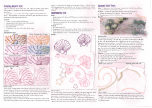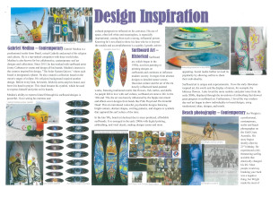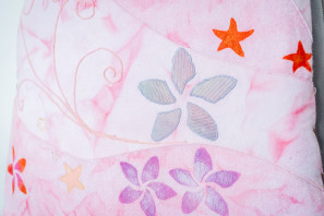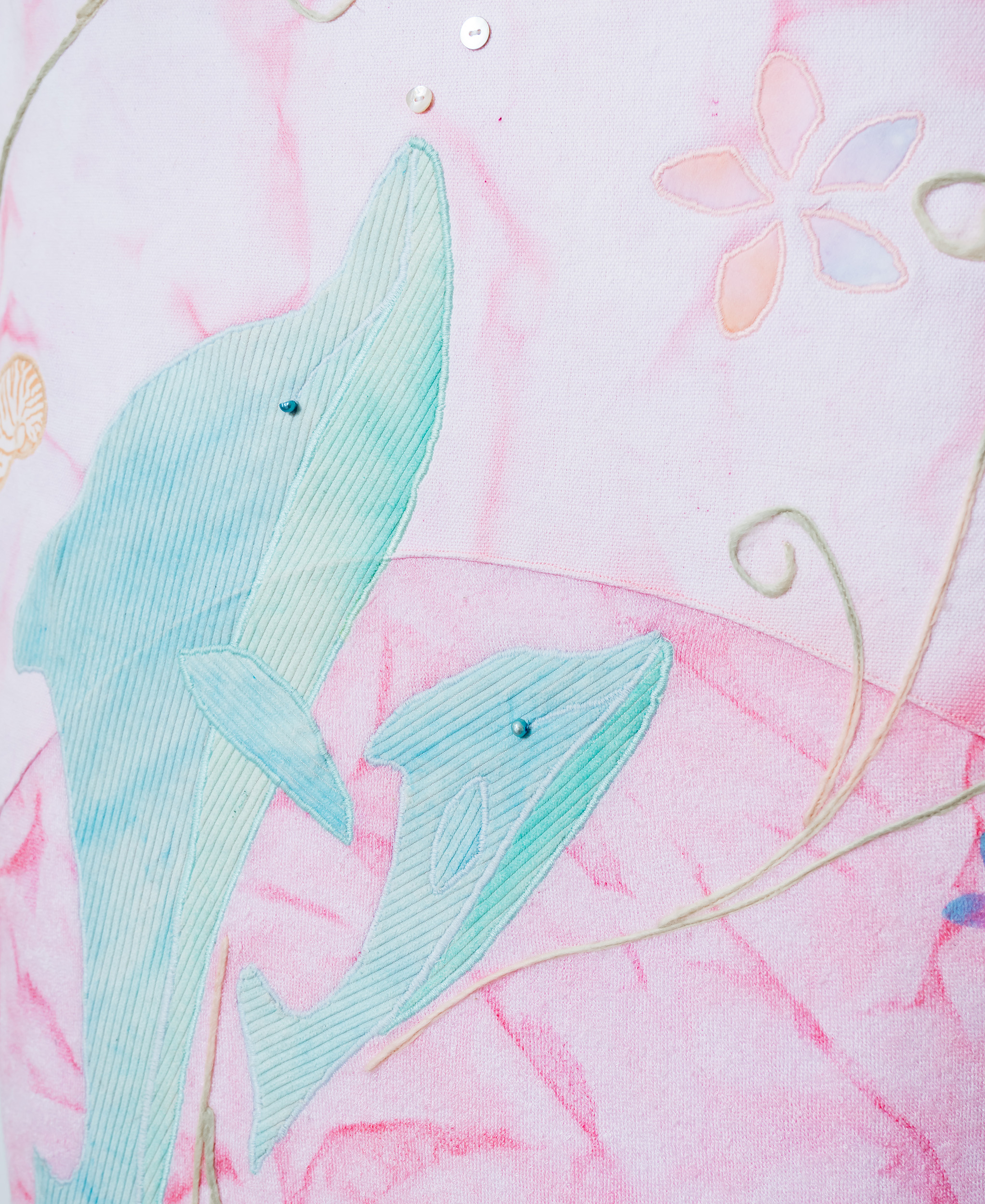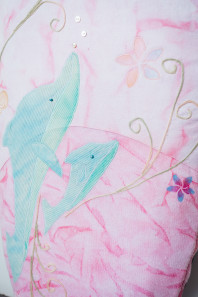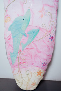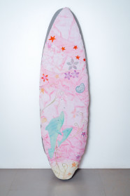 The textile item, Crystal Waters Covers, is designed to protect a surfboard by providing a soft layer that minimizes damage like dings or scratches from sharp objects. The cover also serves as a canvas for self-expression. The surfboard cover will be used during travel and storage, such as car rides to the beach, surf trips, and when stored in the garage. Designer Jon Wright is a source of inspiration for the textile item. Wright captures the ocean to freeze moments in time, significantly his images of Gold Coast sunsets, which create the illusion a pink ocean. The fabric has been dyed using the scrunching technique in a magenta-pink tone to mimic the sunset's reflective colours on the ocean. The scrunch dyeing adds random streaks, evoking the idea of waves and flowing water. Gabriel Medina uses his surfboard as a canvas for self-expression, incorporating printing and painting into his designs. Historical surfboard art from the '50s often featured beach objects and nature scenes. Creative techniques incorporated include stencilling, machine embroidery, hand embroidery, and appliques to depict beach objects such as shells, flowers, and animals.