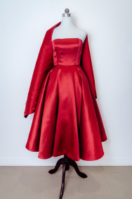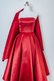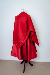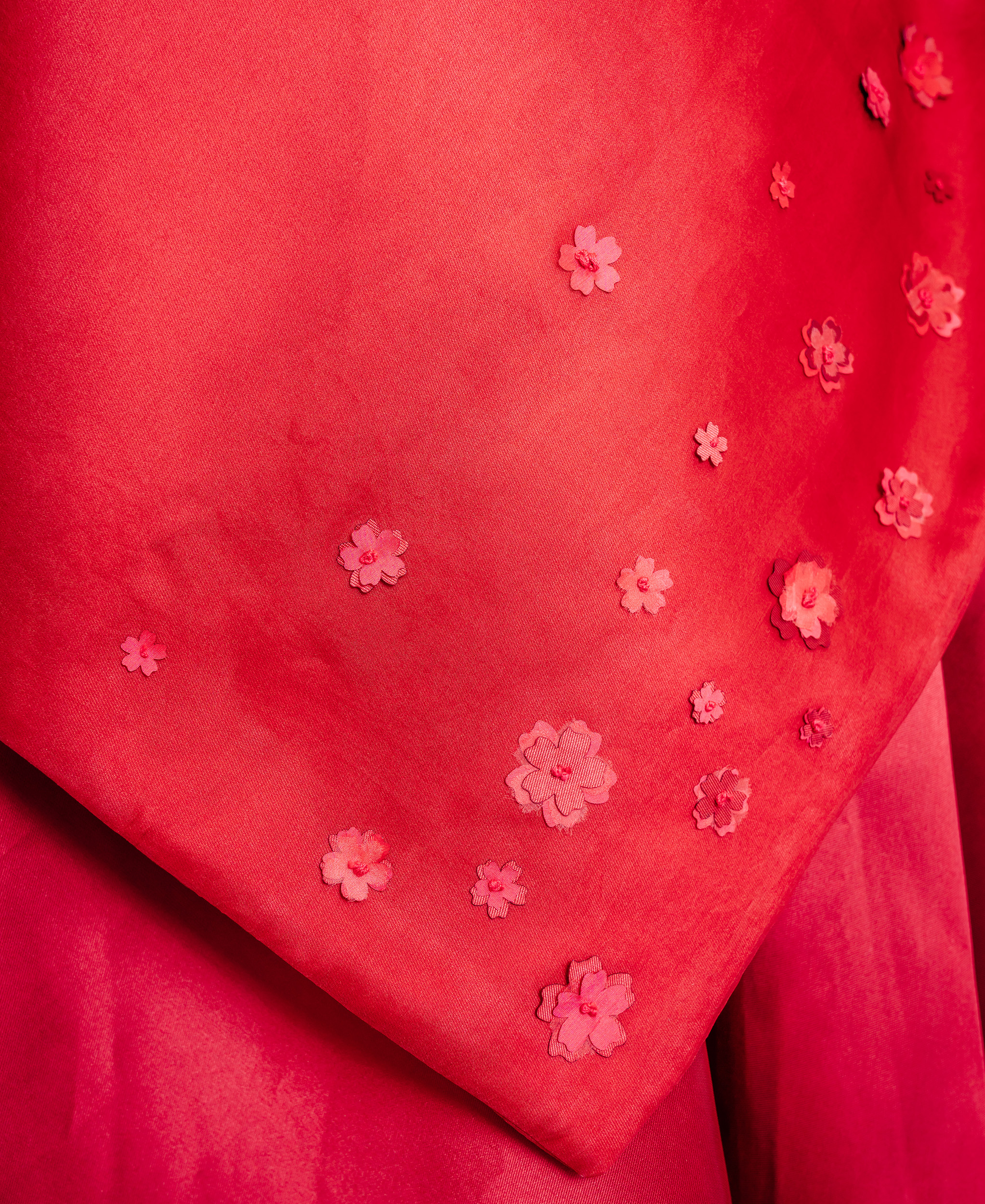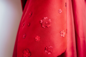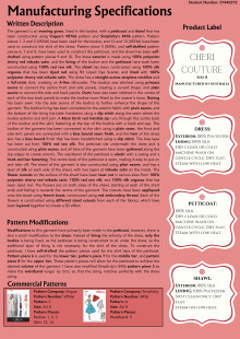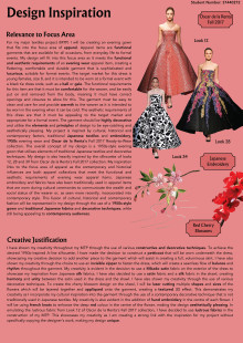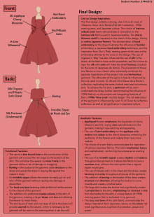 The textile item is an evening gown it is intended to be worn at a formal event with a black-tie dress code, such as a ball or gala. The item is inspired by cultural, historical, and contemporary factors, traditional Japanese textiles and embroidery,1950s evening wear and Oscar de la Renta’s Fall 2017 Ready-to-Wear collection. The overall concept of the design is a 1950s-style evening gown that utilises elements of traditional Japanese textiles and decorative techniques. The design is also inspired by the silhouette from Oscar de la Renta’s Fall 2017 collection. Japanese embroidery and fabrics have been traditionally used in apparel items that are worn during cultural ceremonies to communicate the wealth and social status of the wearer or as seen more recently, incorporated into contemporary style gowns. The textile item represents a contemporary fusion of cultural, historical, and contemporary fashion using a 1950s-stylegown and traditional Japanese fabrics and decorative techniques.