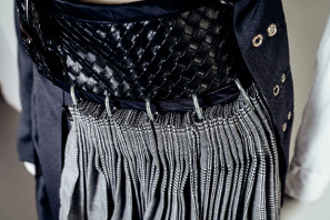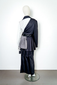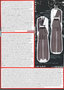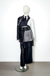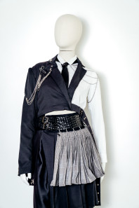 The textile item explores the concepts of changing industry and its relation to decade's old subcultures of the streets of Tokyo, Seoul, London, and New York, and the everlasting impact on of the Hallyu wave (1990's-current), all the way to the recent cult following of the live shows of Taylor Swift (The Eras tour) and Beyonce (Renaissance tour). The item showcases the rise of unisex fashion within recent runway shows of high-end brands that are pushing the understanding of the binary, while also showcasing the curated styles and concepts that go hand in hand with the music being produced within the 21 st century and what is next to come. As the hold Covid had on the live entertainment industry slips away there has been a boom in world tours of Musicians. In 2023 the likes of Beyonce, Taylor Swift, The Weekend, Olivia Rodrigo, Stray kids, Enhypen and TxT made their impact on the world music scene with record breaking tours. Consisting of an average length concert of 2 and a half hours these shows had elaborate stages, special effects, and costumes. The item is made from adaptable base pieces including a blazer and wide leg pants allowing for different versions of the costume to be made. The versatility of the different items in the costume means the performer can have different stage looks as the skirt and blazer can be removed to provide alternate looks, this ability to interchange piece allows for a smaller amount of garments to be travelled with, but still lets there be a large variety of looks across a tour not jeopardizing visual looks over space.